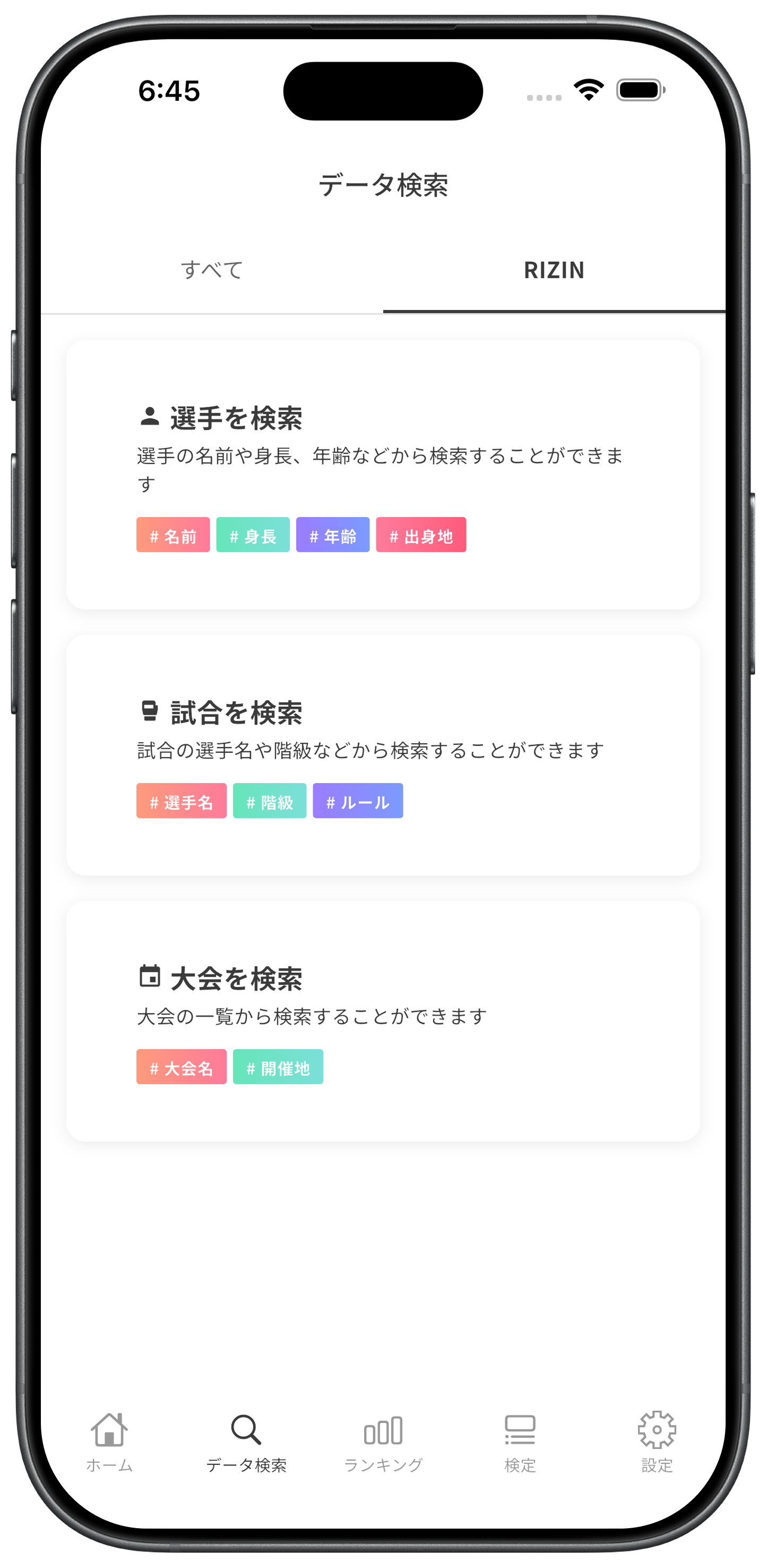 格闘技の知識を試すための検定が用意されています。団体ごとの知識を試す検定に挑戦できることで、自分の格闘技の知識を試して楽しんで、他のユーザーと競争することができます。
