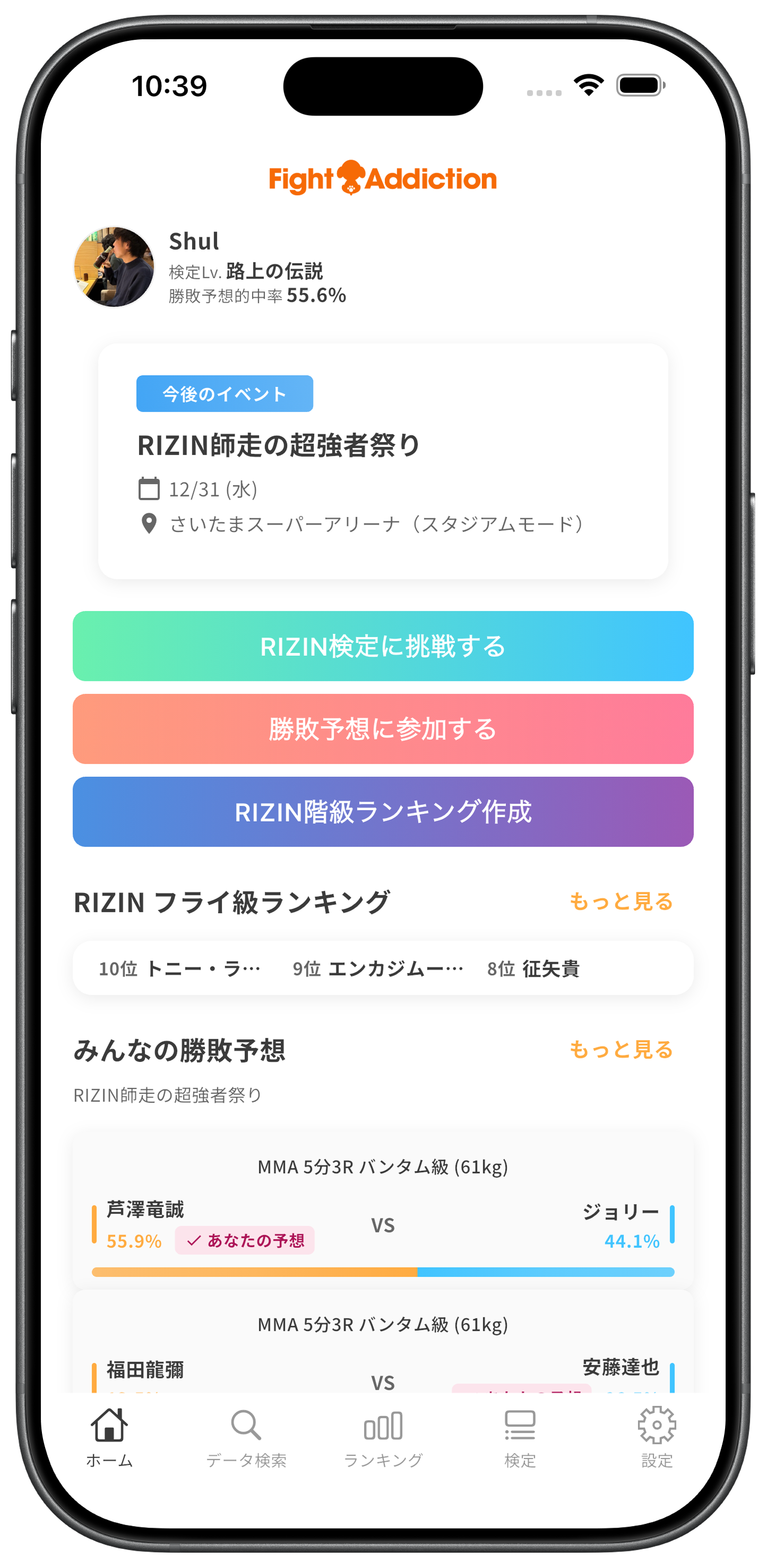 勝敗予想や階級ランキング、検定挑戦結果が表示されたプロフィール画面で、自分も他の格闘技ファンも楽しめます。